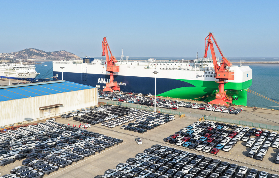在江苏连云港港,一艘滚装船在装运出口汽车 图片开端:新华社