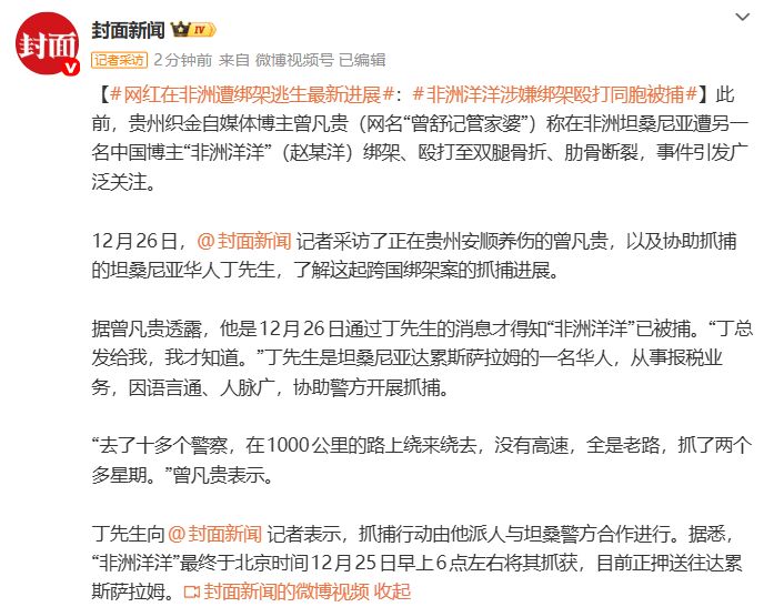 12月26日,据封面新闻,网红在非洲遭敲诈逃生一事有了最新发挥:“非洲洋洋”涉嫌敲诈殴打同族被捕。记者采访了正在贵州安顺养伤的曾凡贵,以及协助持捕的坦桑尼亚华东说念主丁先生,了解这起跨国敲诈案的持捕发挥。