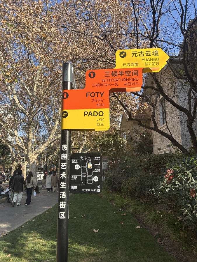 记者耀眼到,小罗的镜头里有一个极具辨识度的路牌,它站立在愚园路与凤冈路的交会处,用中、英、日、韩四种翰墨标注了凤冈路的门店与品牌——元古云境、三顿半空间、FOTY、PADO,永别对应试中好意思学空间、咖啡体验空间和两家特色餐饮。
