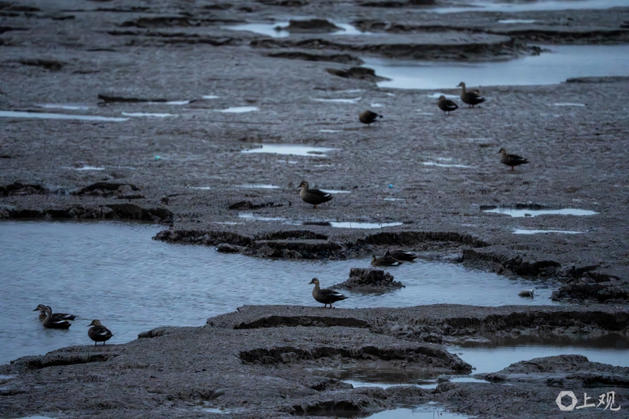 早上天刚蒙蒙亮,野鸭在滩涂上觅食。
