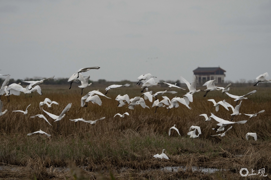 上海崇明东滩鸟类国度级当然保护区内栖息的野生鸟群(图中为白鹭居多,还有黑脸琵鹭)。