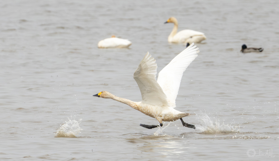 大天鹅在水面上快速 “踏水” 助跑, 双脚激起层层浪花, 振翅升起。