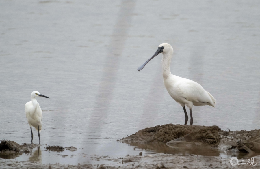 白鹭(左)与白琵鹭(右)。