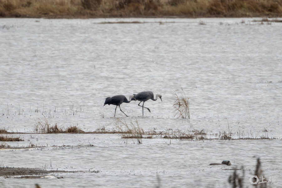 两只灰鹤在浅滩上觅食。