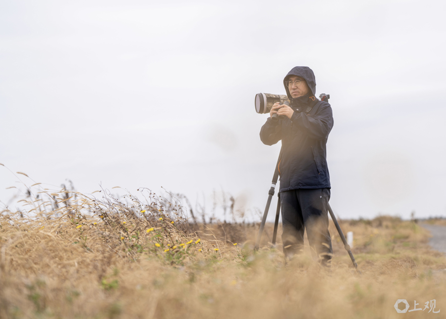 上海崇明东滩鸟类国度级当然保护区生态建立科责任主谈主员冯雪松正在不雅察记录鸟群。