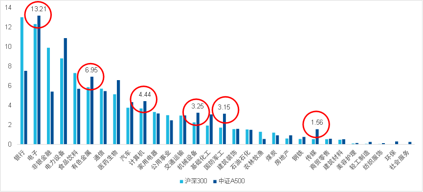 图:A500指数相较于沪深300超配电子、有色金属、计较机等行业